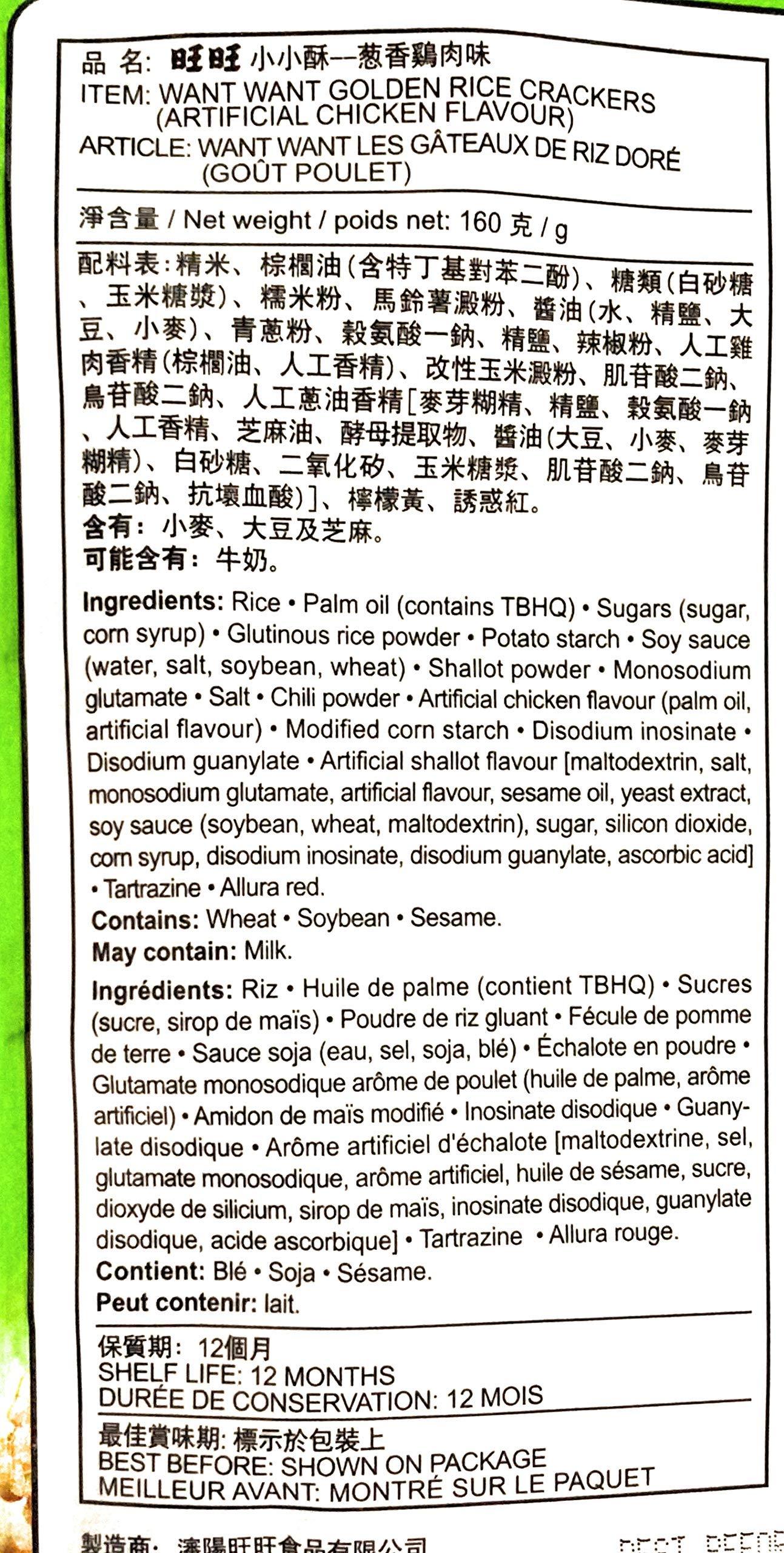2 Pack Want Want Golden Rice Crackers (Artificial Chicken Flavour)160g Each 旺旺葱香雞肉味小小酥