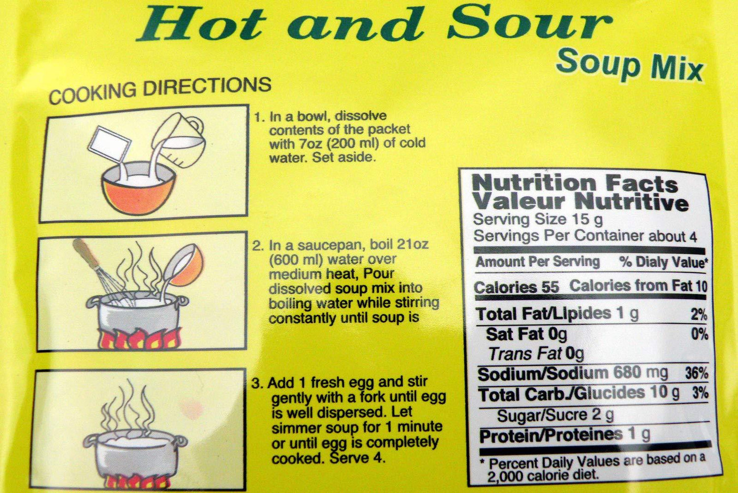 The package contains 6 packets of Chinese Hot & Sour Soup Mix, each packet's net weight is 2.12 oz (60 g). Please read the ingredients in image 3, nutrition facts and cooking directions in image 4.