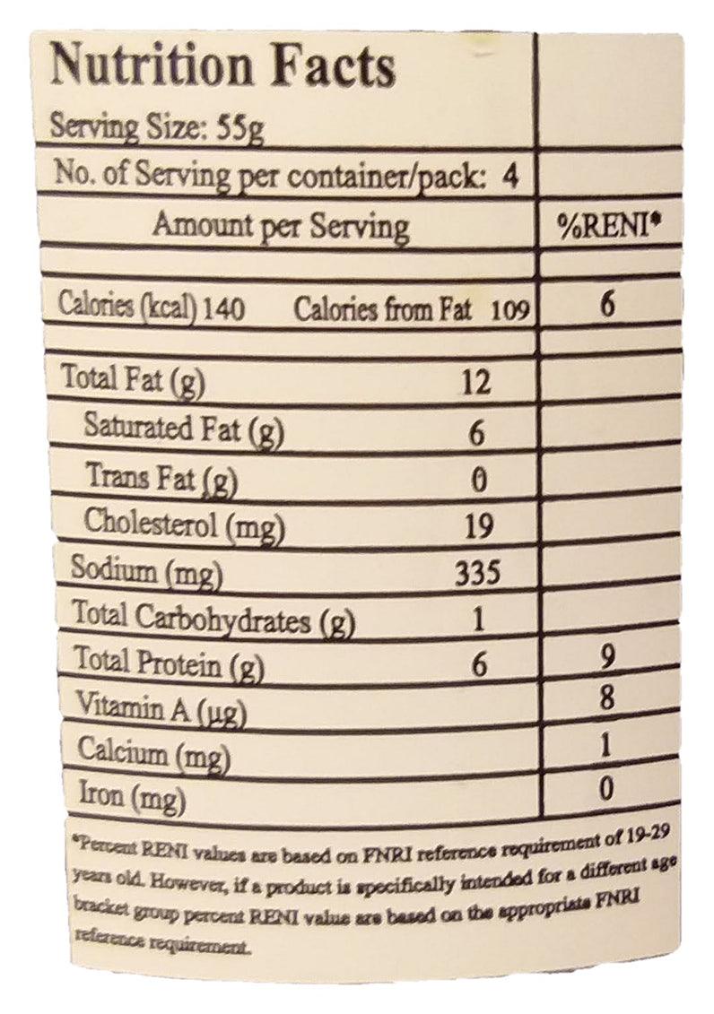 Milkfish, Corn Oil, Water, Soy Sauce, Vinegar, Fresh Garlic, Brown Sugar, Modified Starch, Ground Pepper, Iodized Salt, Pepper Corn, Bayleaf.
