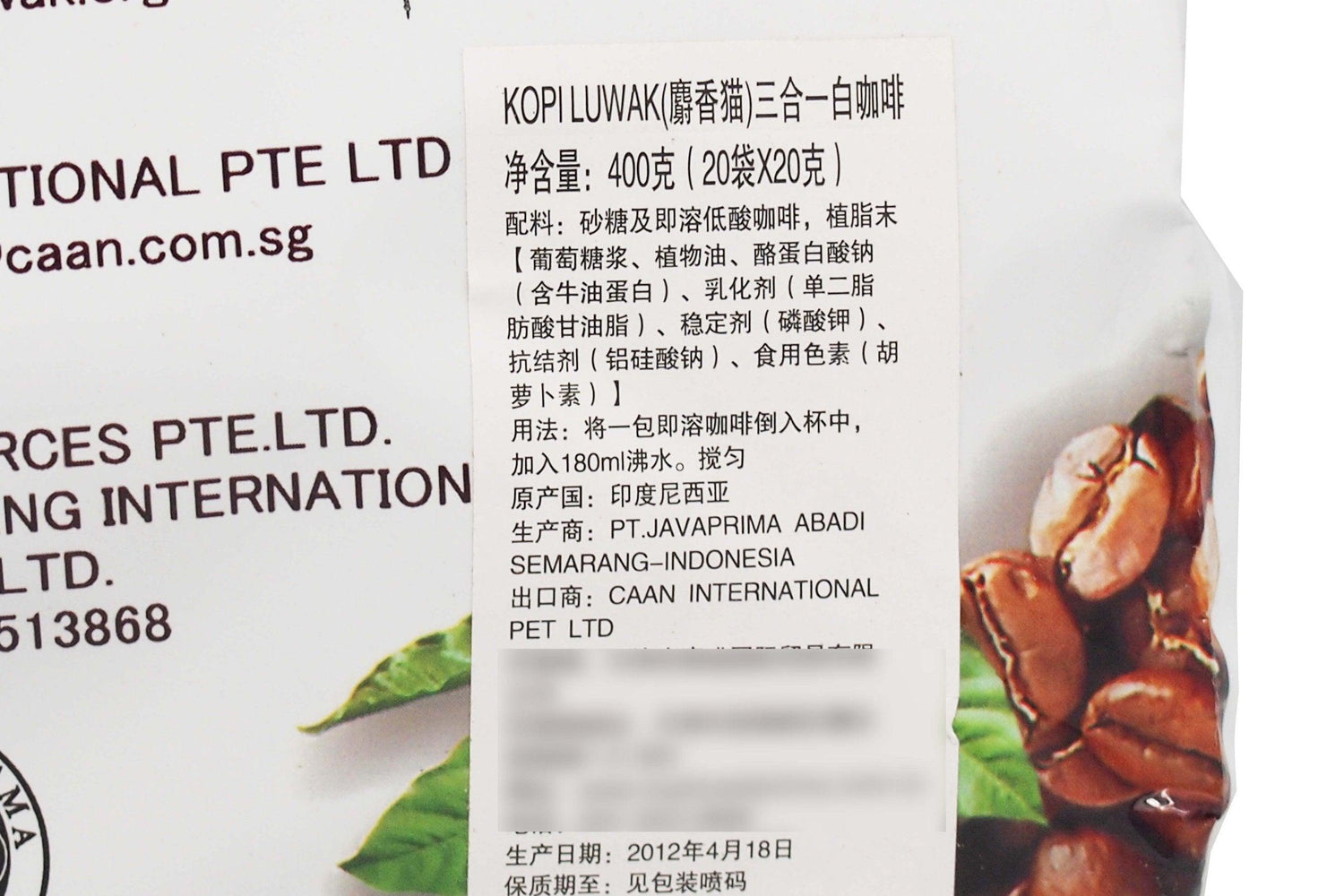 Kopi LUWAK LOW ACID, 100% Pure Wild & Orgranic Civet Coffee, Instant WHITE KOFFIE (3 in1) 20 gram (Case of 10 Bags/200 Sachets)
