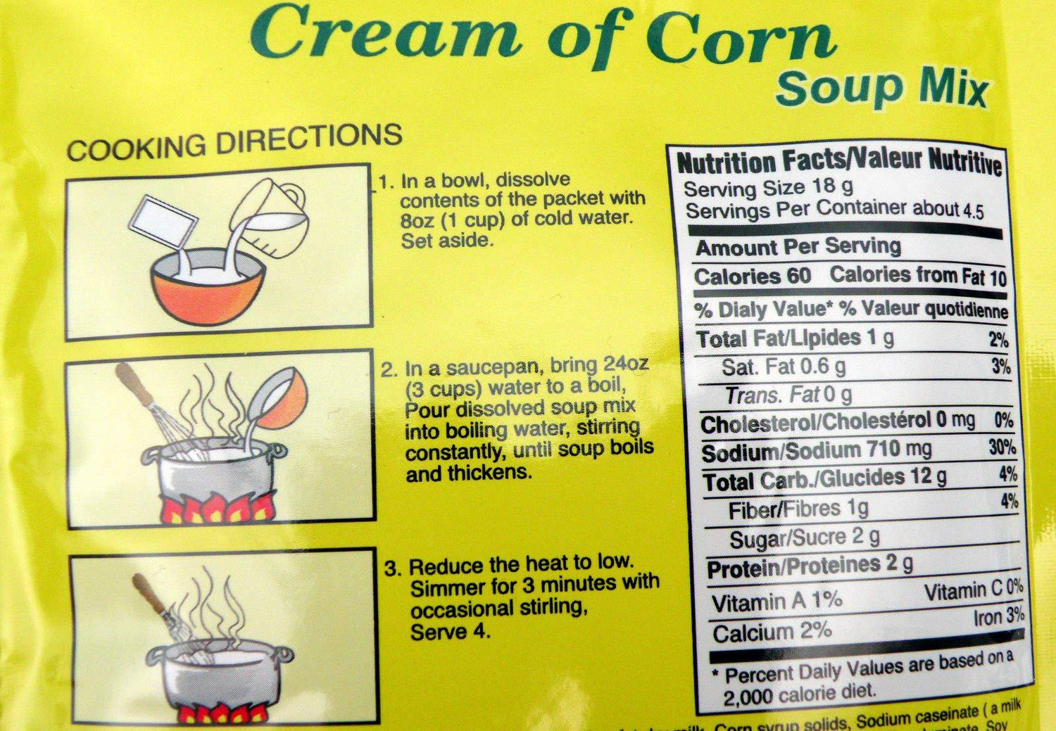 The package contains 6 packets of Chinese Cream of Corn Soup Mix, each packet's net weight is 2.82 oz (80 g). Please read the ingredients in image 3, nutrition facts and cooking directions in product image 4.
