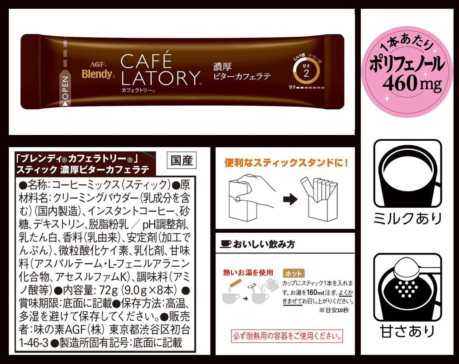 AGF Blendy Cafe' Latory, 8 sticks (Strong Bitter Cafe' Latte | Sweetness: 2)