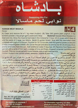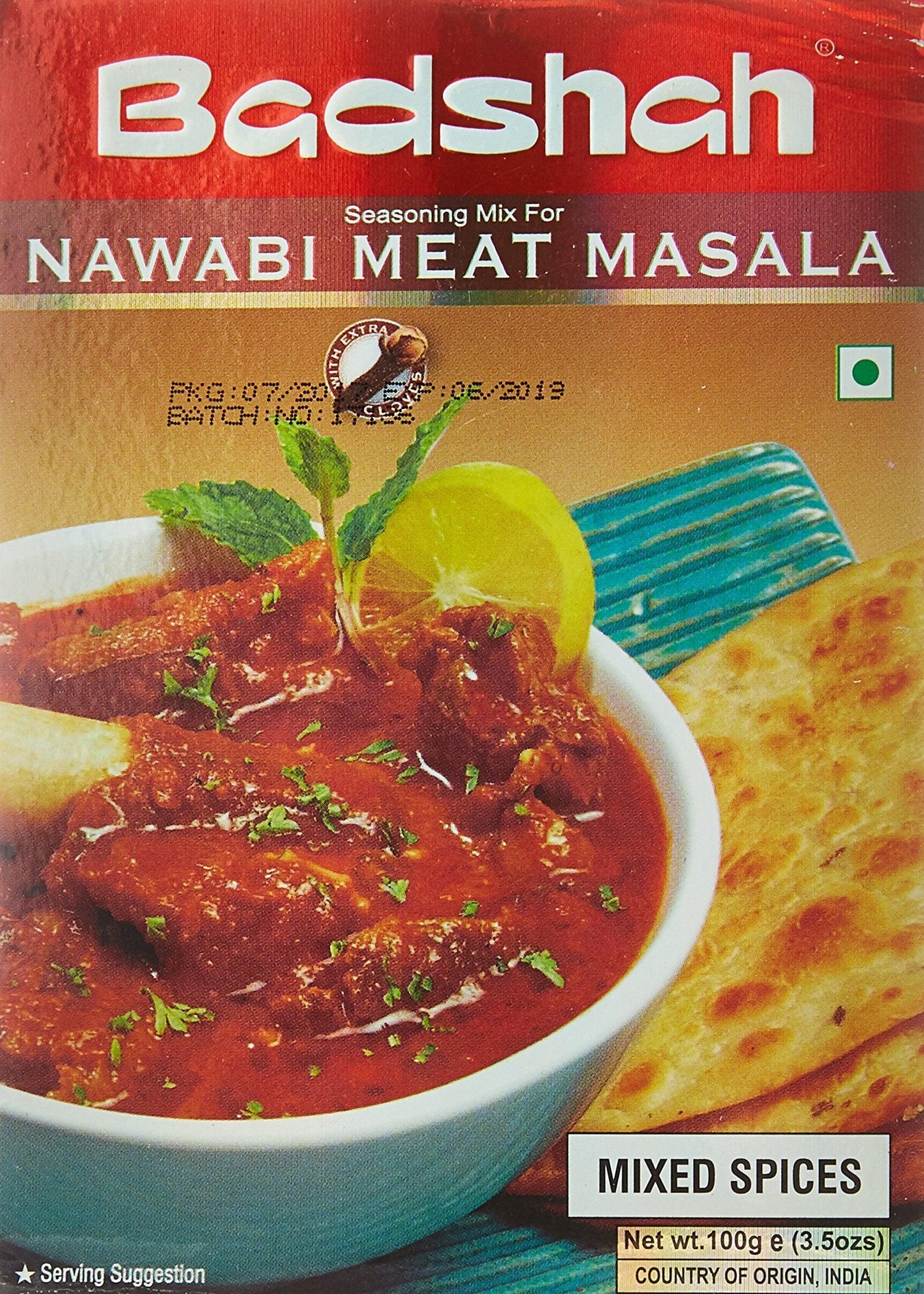 Badshah Nawabi Meat Masala is a special blend of Indian spices ideal for cooking any kind of meat. For enhanced flavor, add it sparingly to meat sauces, pasta sauces, gravies, stews, soups, chili con carne, casseroles and stuffing mixes.