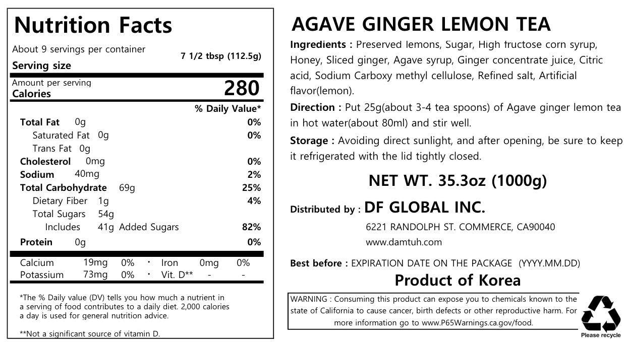 - Enjoy the refreshing and soothing taste of Korean agave ginger lemon tea, made with selected prime Korean ginger and lemon.