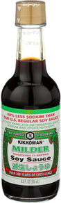 Kikkoman's soy sauce is a traditionally brewed to retain delectable flavor. The salt content is reduced through an extraction process leaving this milder sauce with 48% less sodium. Our sauce comes in an 8.5 ounce bottle and is made with simple ingredients. Kikkoman sauces are excellent all-purpose seasonings and products of japan.
