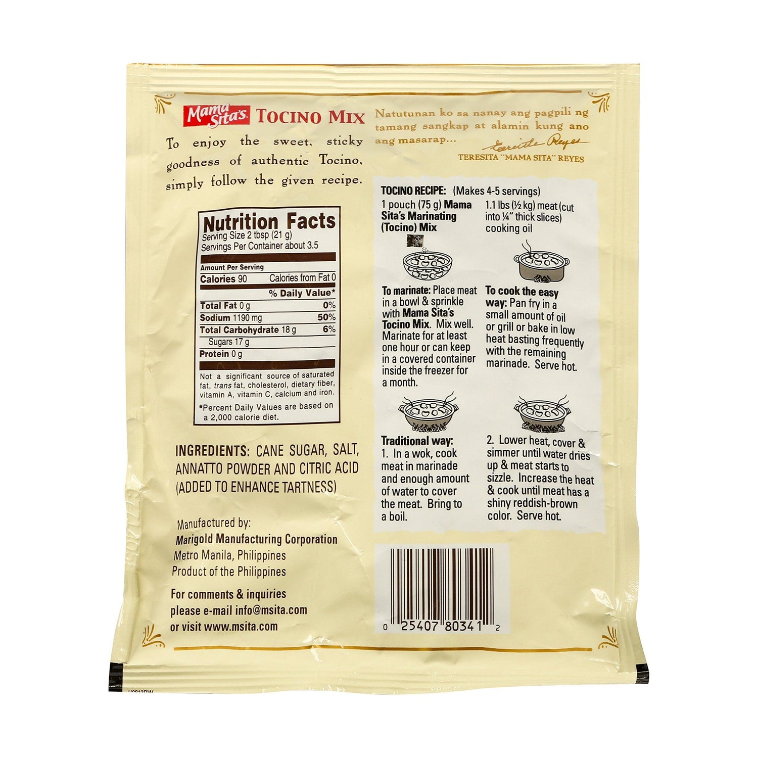 Mama Sita's Tocino Marinating Mix (75g/2.6 oz.) Enjoy the sweet, sticky goodness of authentic Tocino. The perfect Filipino seasoning outside the Philippines. A savory mixture of sugar, spices and natural Annatto. Make the authentic Tocino quick and easy--just follow the given recipe on the back of the package! Free from chemical preservatives, phosphates, artificial coloring and unhealthy nitrates. Enjoy the sweet Sticky goodness of authentic Tocino. Expertly blended spices offer quick, delicious meals. Making Tocino has never been this easy--just follow the instructions on the back of the package!